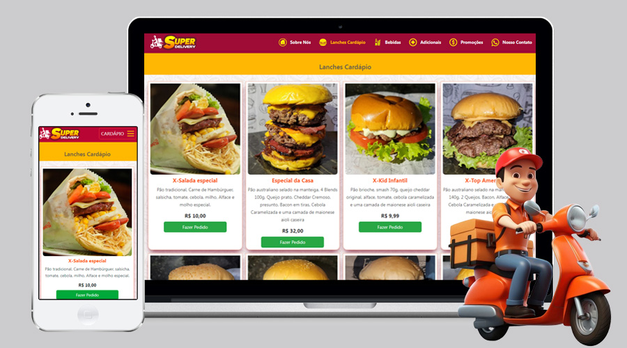 Transforme seu Delivery em um grande sucesso na sua região com um site profissional. Atraia mais clientes, ganhe confiança e se destaque no mercado com um site exclusivo desenvolvido para alavancar o seu negócio. Ofereça para os seus clientes uma experiência de compra inovadora permitindo que façam pedidos com apenas alguns cliques.